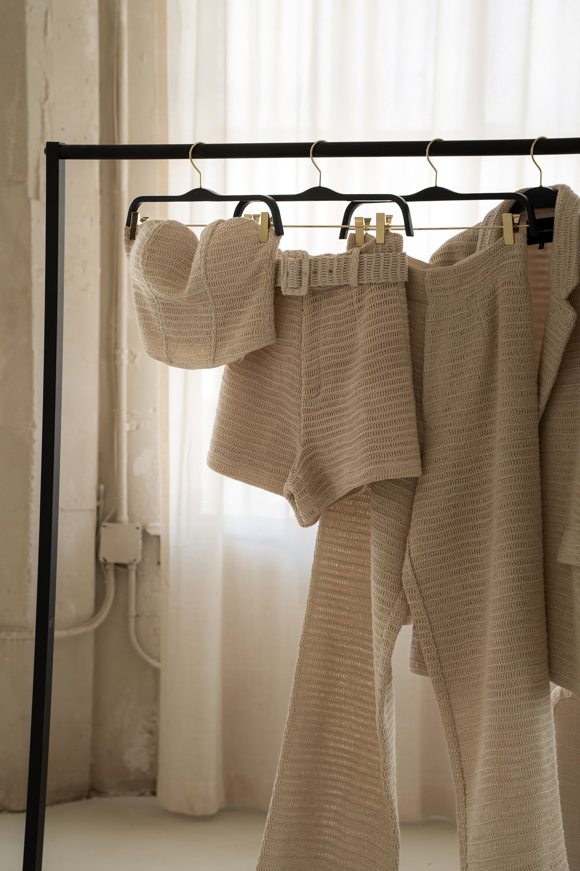 Bring sophisticated style to your next vacation with our Beige Kelsie Belted Shorts. Made with intricately woven crochet material, these shorts are both stylish and comfortable. Featuring a matching square buckle belt with hook and bar zipper closure, and front/back darts, they're perfect for any occasion. Pair with our Lila Bustier for the full look. No stretch. Double lined.