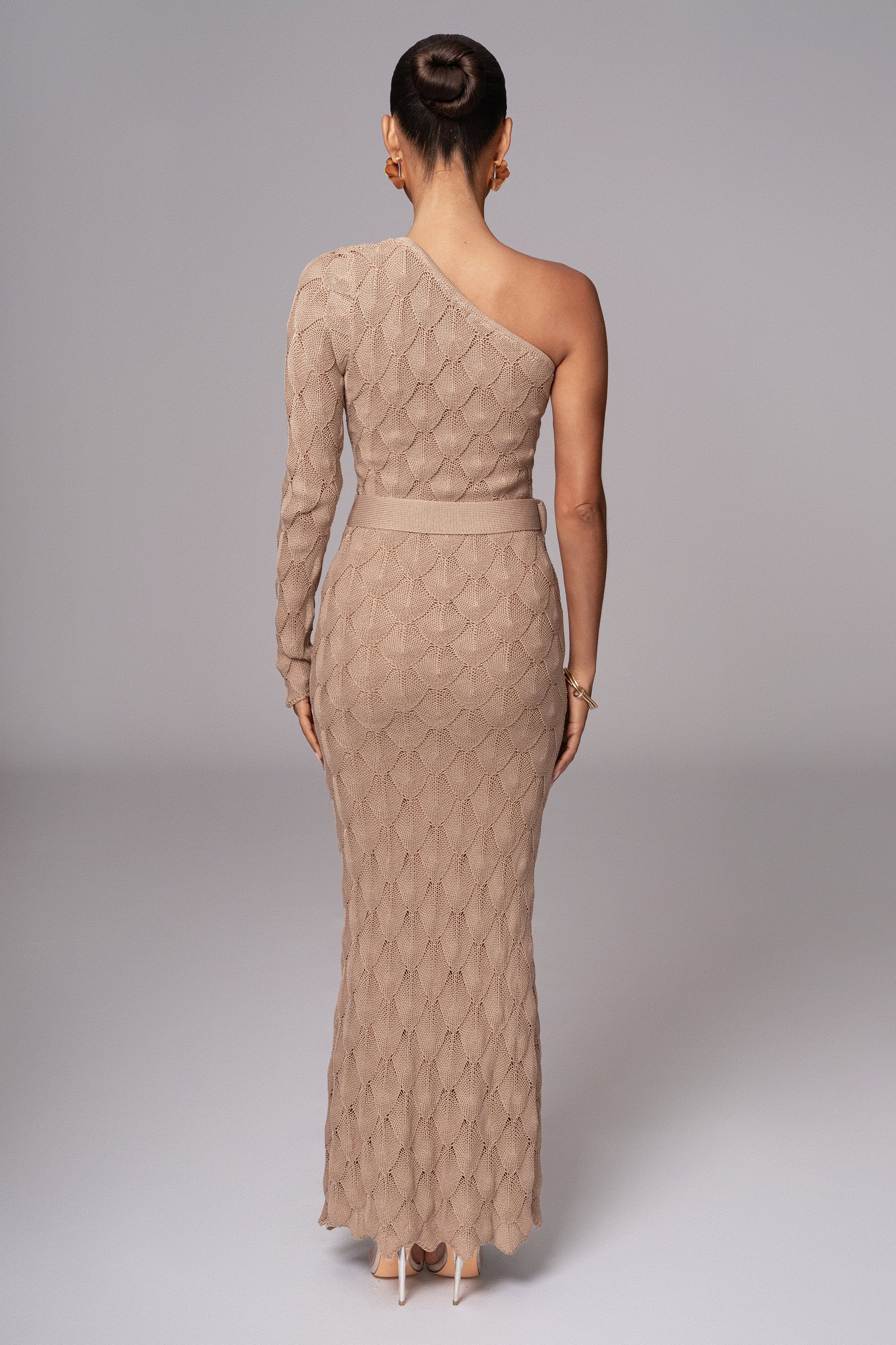 Indulge in luxury with our Beige La Costa One Shoulder Dress. This stunning maxi dress features a one-shoulder neckline with a long sleeve arm and a matching belt with marbled rectangle buckle. Crafted from a diamond shape knitting way with nude underlining, this dress is perfect for any occasion. Stretchy.